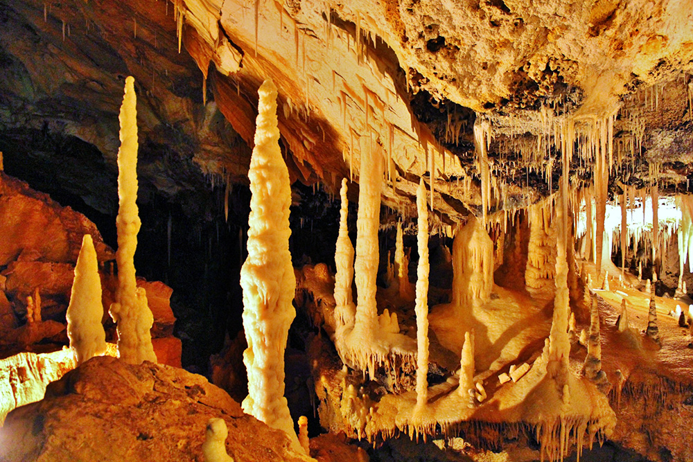 鍾乳洞は石灰岩の地層にできる洞窟で、その内部で落ちる水滴には石灰岩から溶け出した炭酸カルシウムが含まれています。これが再び結晶化して、少しずつ鍾乳石が育っていくのです。1センチ成長するのに100年以上かかるともいわれ、なかには12メートルにもなるものもあります。小さな水滴がつくり出す「大きな仕事」には、ただただ驚かされます。